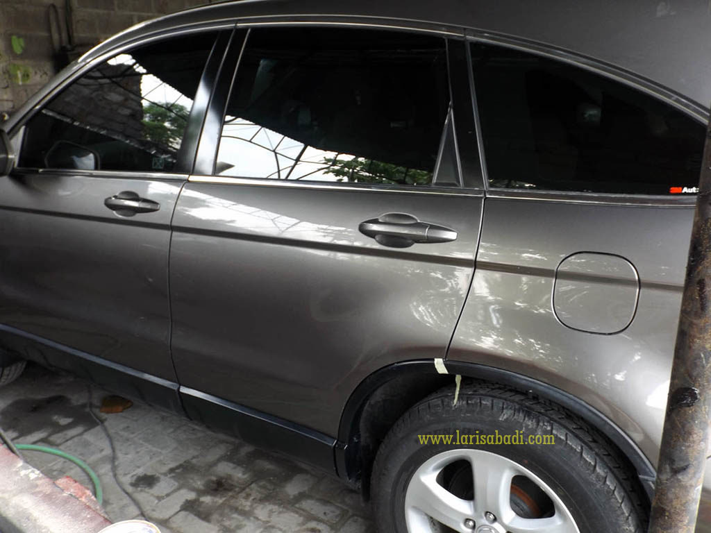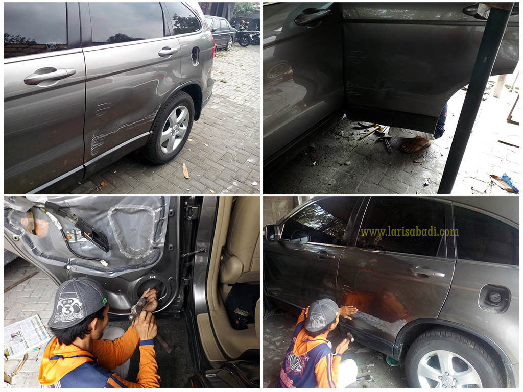 Milik konsumen kami, Mr.Body D ini adalah generasi ke-3. Body CR-V generasi ini sudah mulai bongsor, tidak lagi kompak. Nah, karena belum terbiasa dengan mobil yang baru dibelinya ini, Mr.D tidak sengaja menyerempet pembatas jalan ketika akan masuk ke sebuah gang. Alhasil, pintu kiri belakangnya penyok dan baret lumayan.