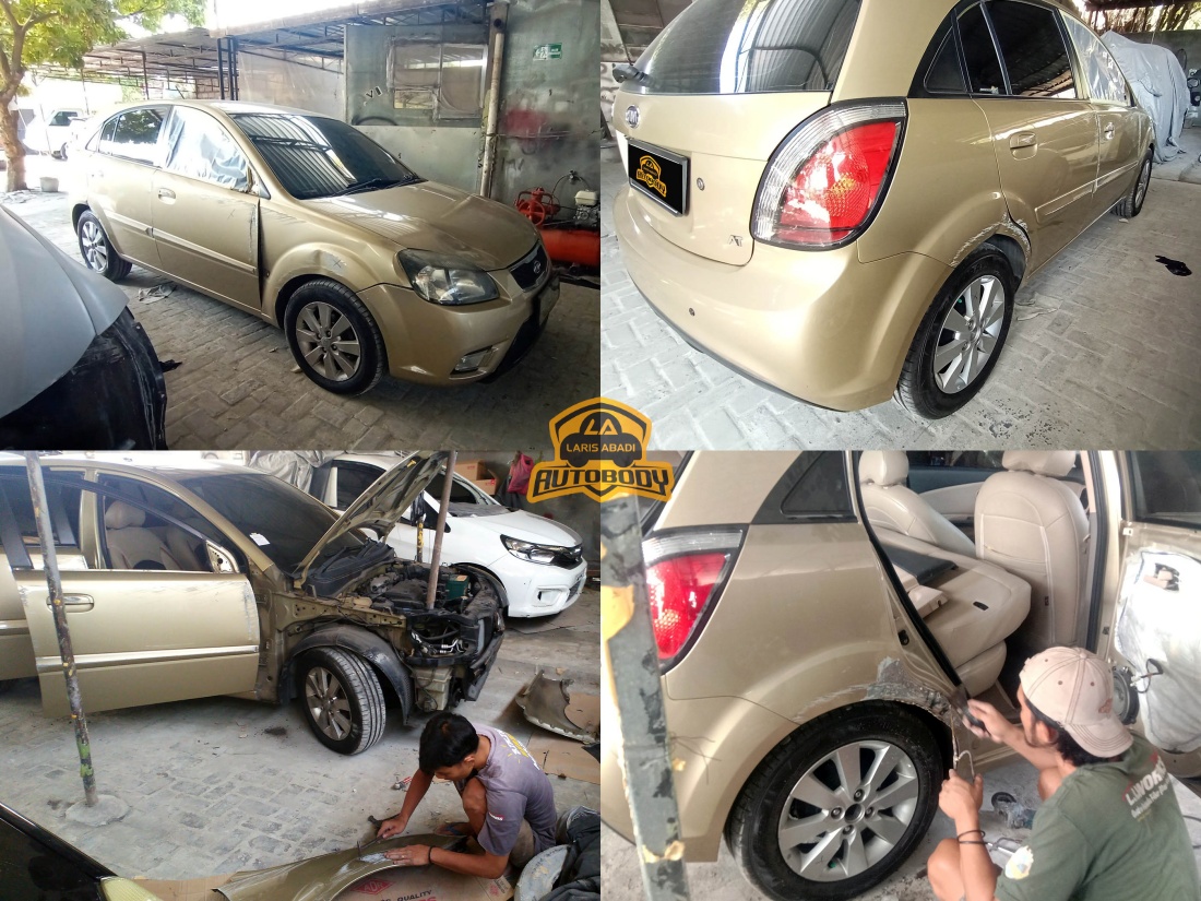 Konsumen Kami, Mrs. S, mempunyai KIA Rio gen 2 atau di sini dikenal sebagai KIA Pride (pada waktu itu untuk membedakan dengan versi taxi nya). Ketika berkendara di jalan sempit, tiba tiba berpapasan dengan kendaraan lain yang lebih besar ukuran nya. Karena sudah tidak memungkinkan untuk minggir ke sebelah kiri, maka KIA Pride Mrs.S ini terserempet oleh kendaraan lain tersebut sehingga mengalami kerusakan dari bumper depan, kap mesin, fender kanan, pintu pintu sampai quarter kanan nya pun penyok dan baret. Bahkan kaca driver (depan kanan) ikut pecah karena benturan yang keras. Oleh karena kejadian kecelakaan ini, maka Mr.S datang ke bengkel kami Laris Abadi yang sudah berpengalaman di bidang bodykit sejak 2011 untuk memperbaiki KIA nya.